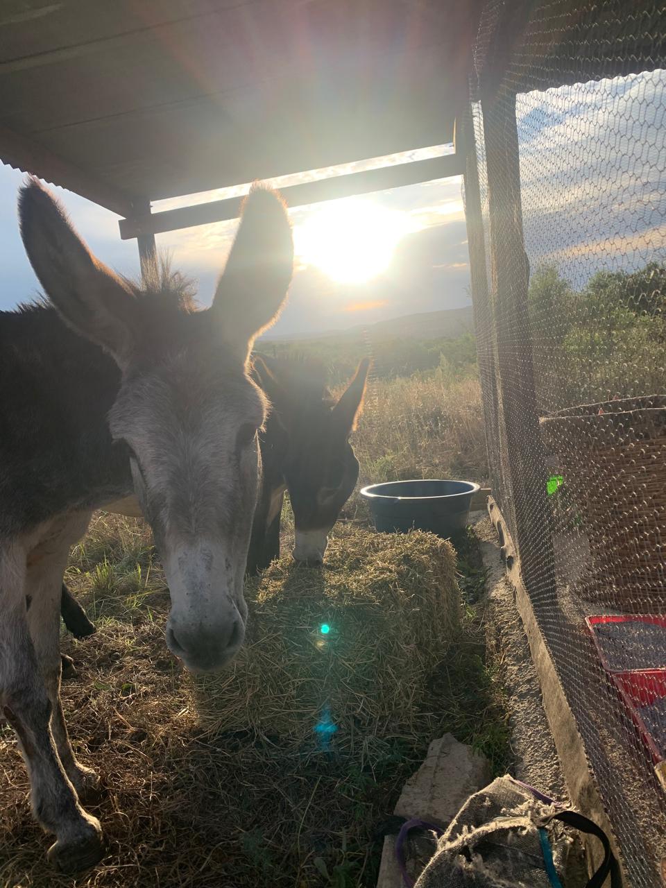 Our sanctuary is also home to rescued farm animals including donkeys, geese, and chickens — all living safely under our care.